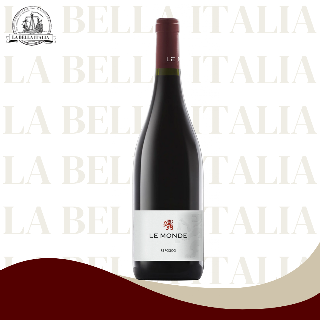 An authentic red wine from Friuli, made from Refosco dal Peduncolo Rosso grapes grown in Le Monde’s estate vineyards. It shows a deep ruby color with violet highlights. The bouquet is rich with aromas of ripe wild berries, cherry, and delicate spicy notes. On the palate, it is full-bodied, smooth, and well-balanced, with velvety tannins and a pleasant freshness that enhances its drinkability.
