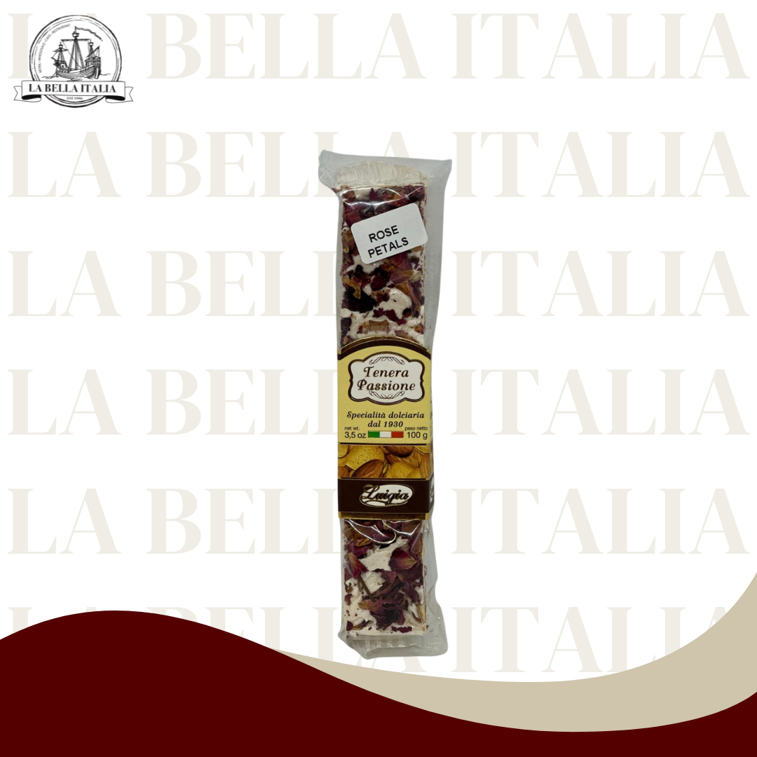 Delight in the delicate elegance of Luigia Dolciaria’s Rose Petal Nougat 100g. Soft and aromatic, this artisanal confection combines the subtle fragrance of rose petals with honey and roasted nuts, creating a light, floral sweetness. Perfect as a sophisticated gift, a special treat, or an exquisite accompaniment to tea and desserts, it embodies the artistry of Italian confectionery.