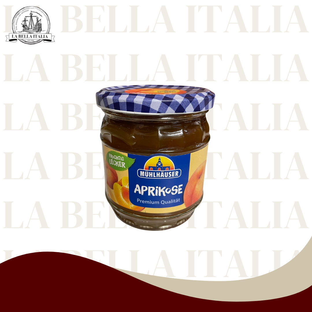 Mühlhäuser Aprikose (450g) is a traditional German “Extra” fruit preserve known for its high fruit content and smooth texture. It is one of Germany’s best-selling apricot spreads, crafted with a heritage that dates back over a century.